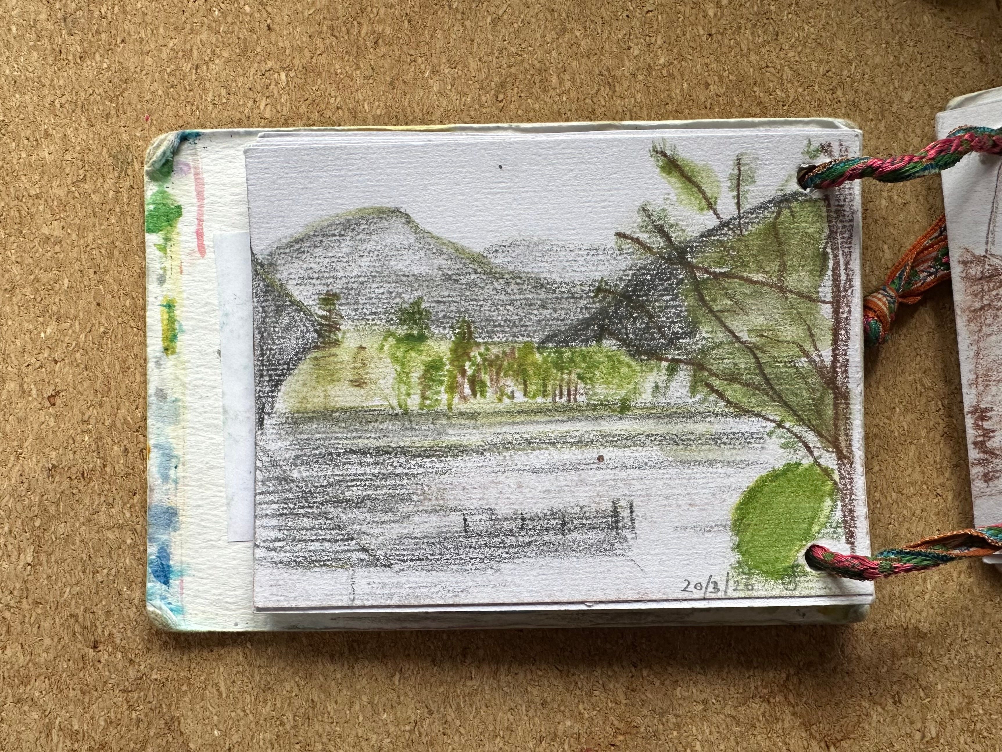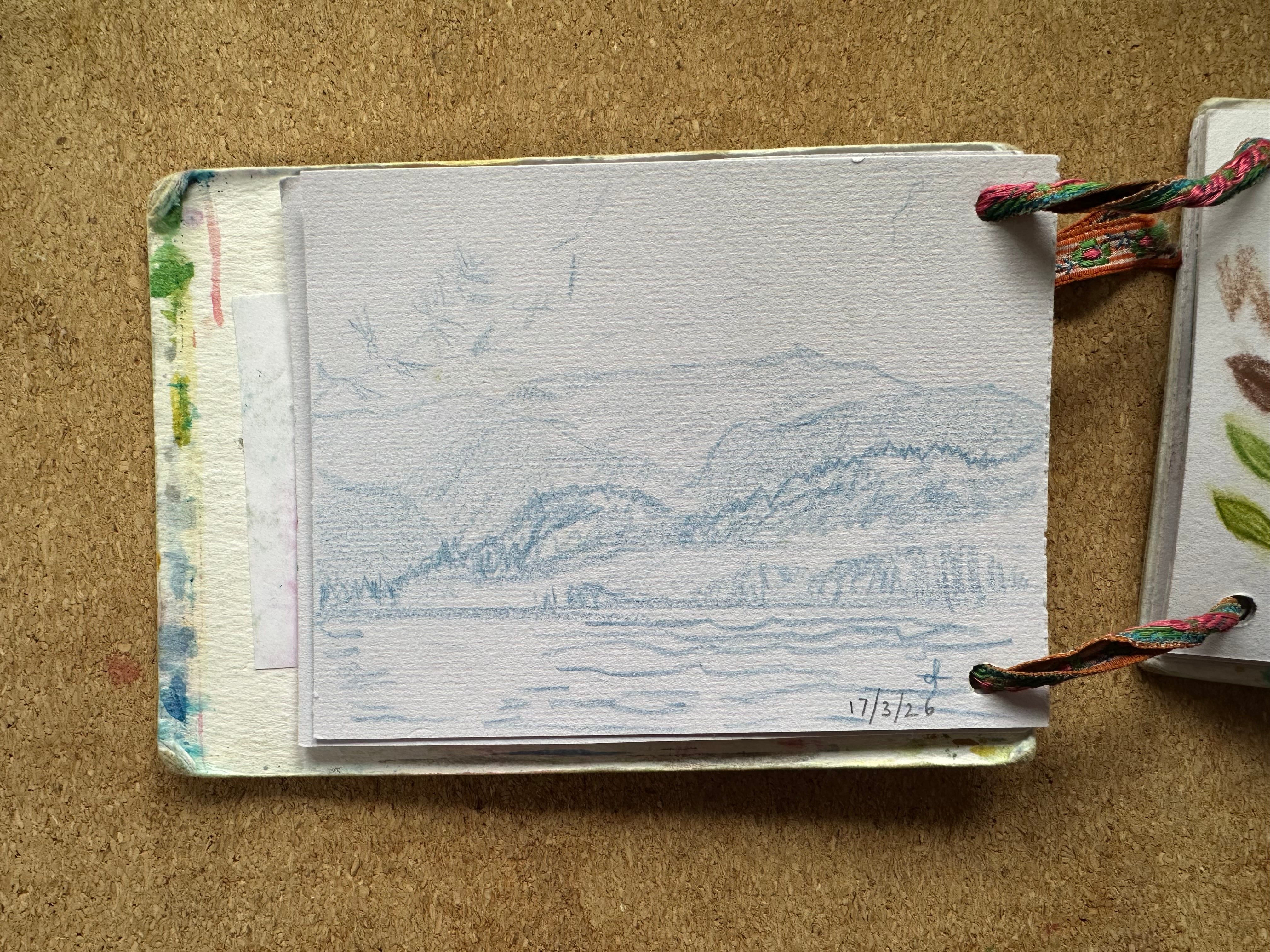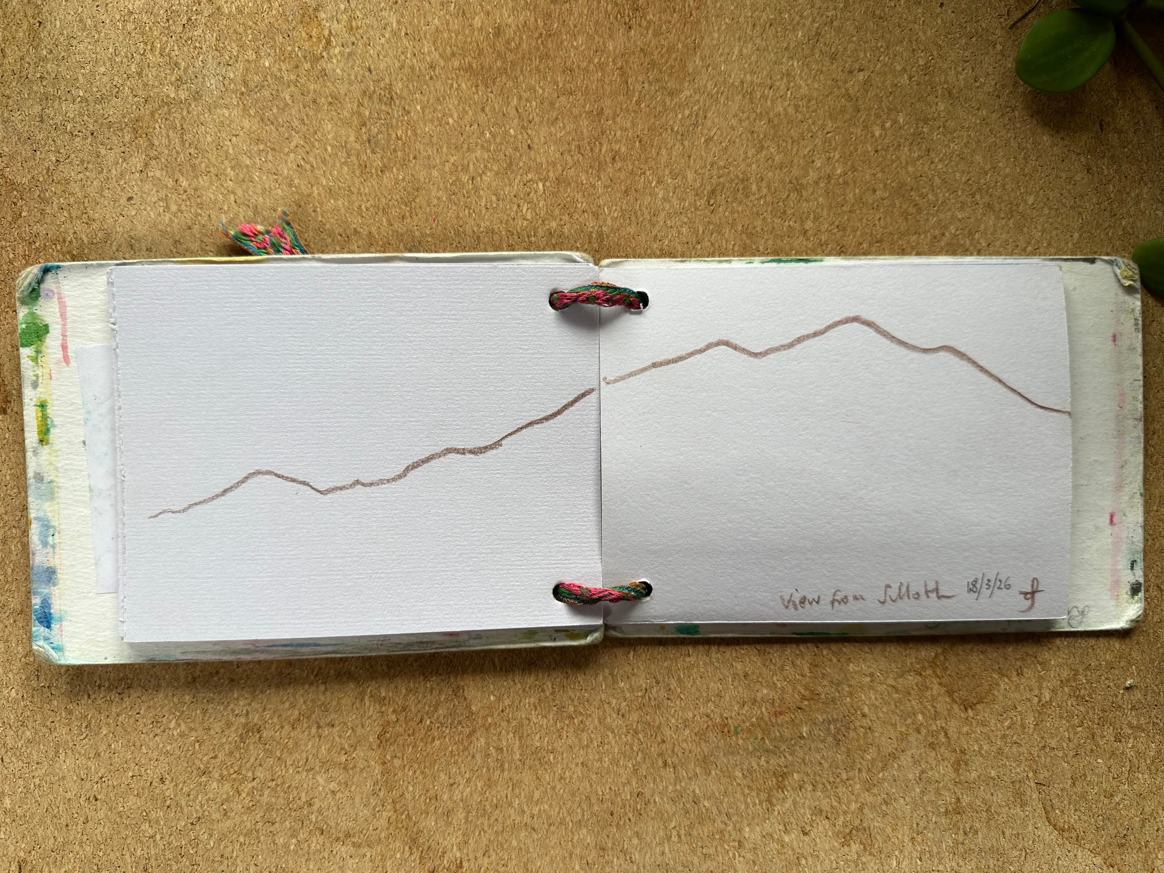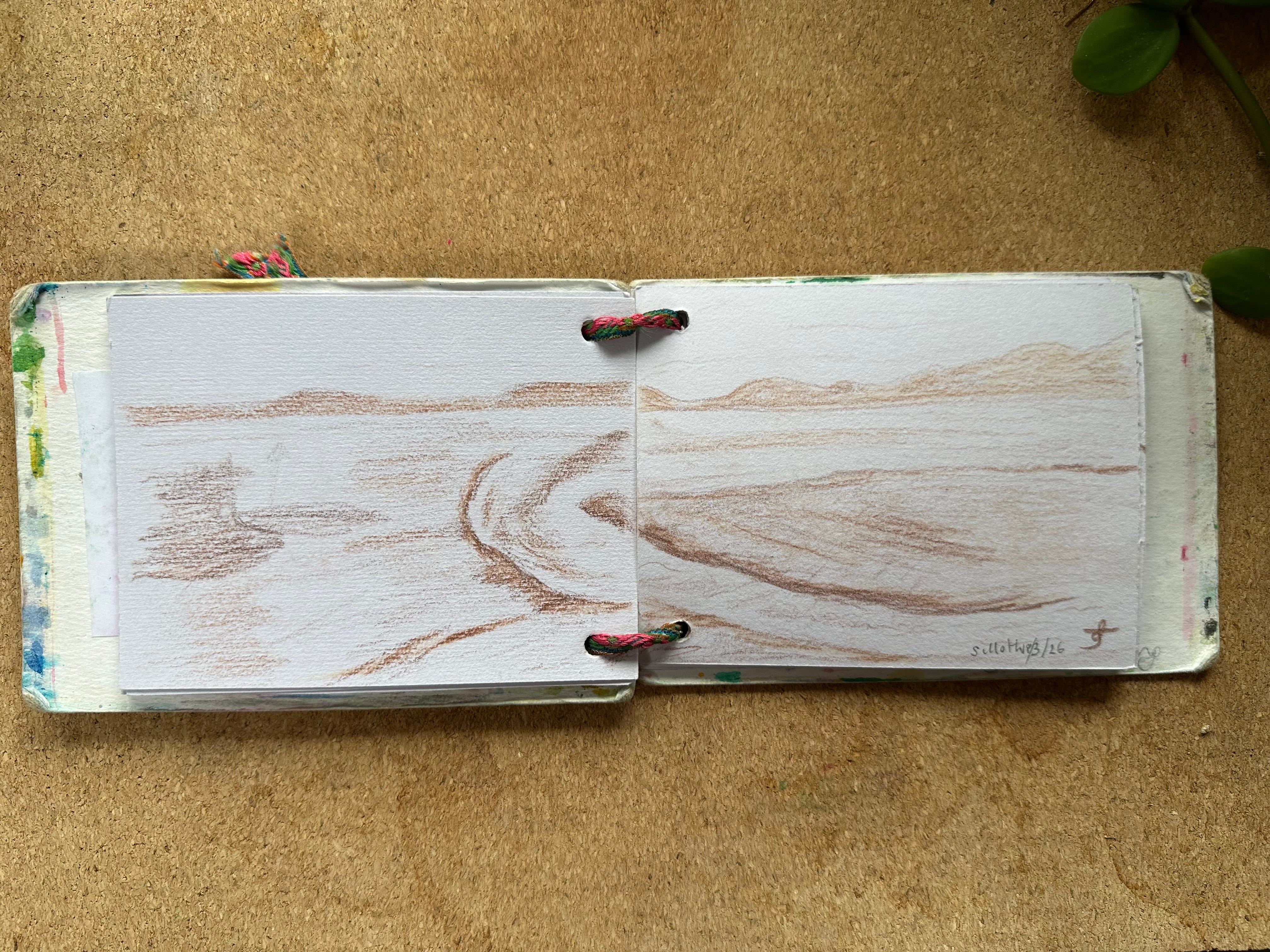 I will post my sketches below for you to see for yourself. I graduated to being a person who makes her own sketchbooks & notebooks a few years ago. These are the simplest ones ever: 2 punched holes, ribbon, paper and card. I’ve got one that is about A6 and one that is about A7 they fit in my pockets along with a pencil or two.
