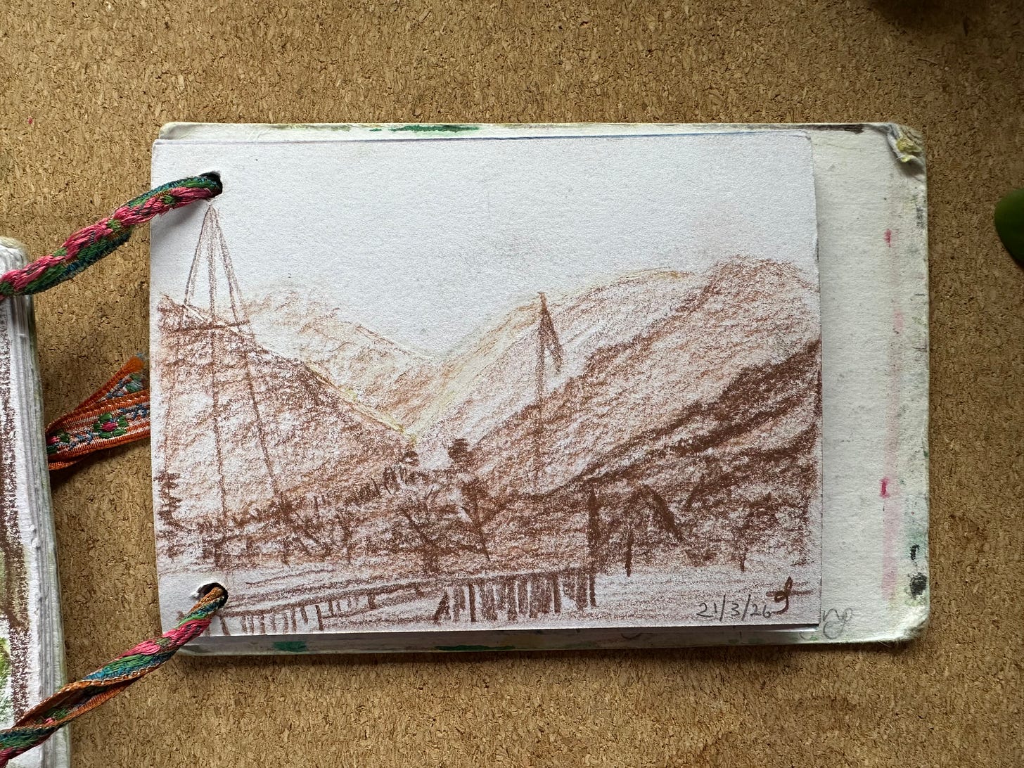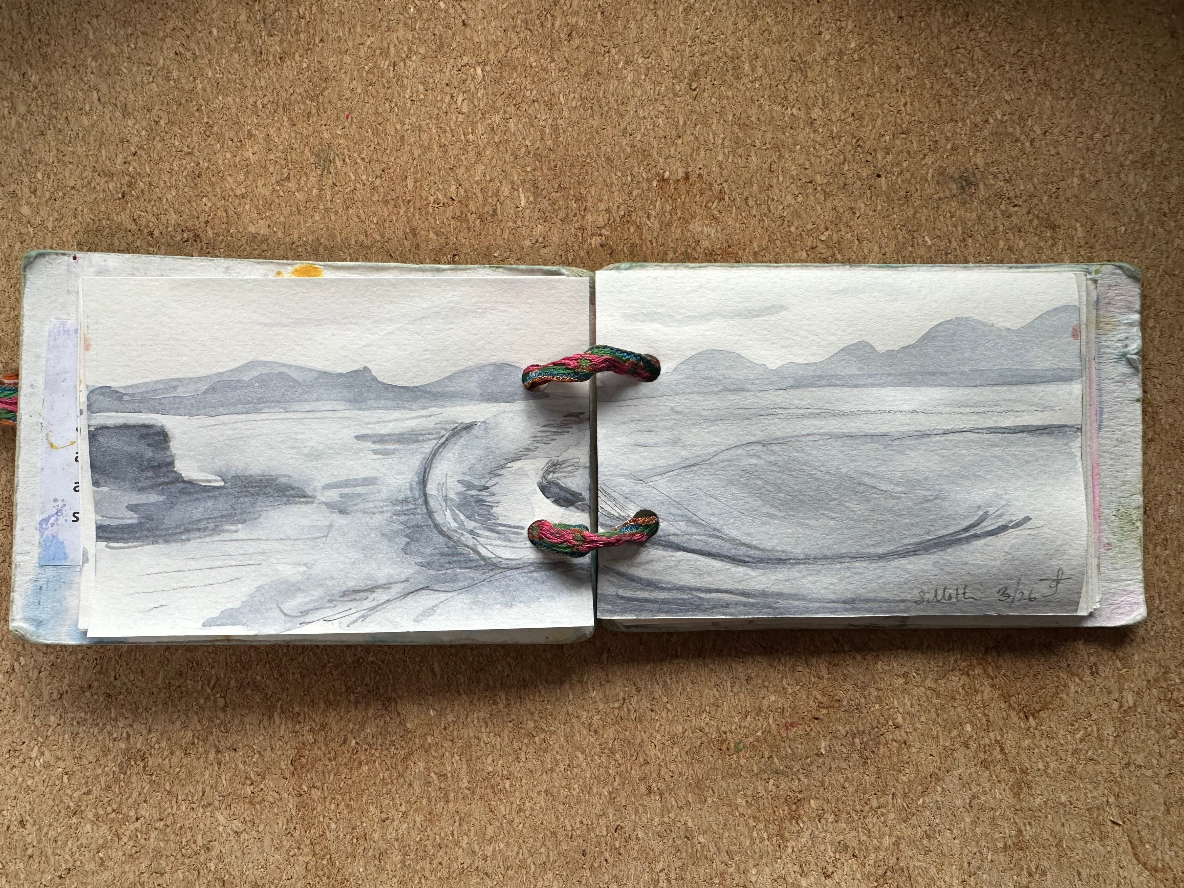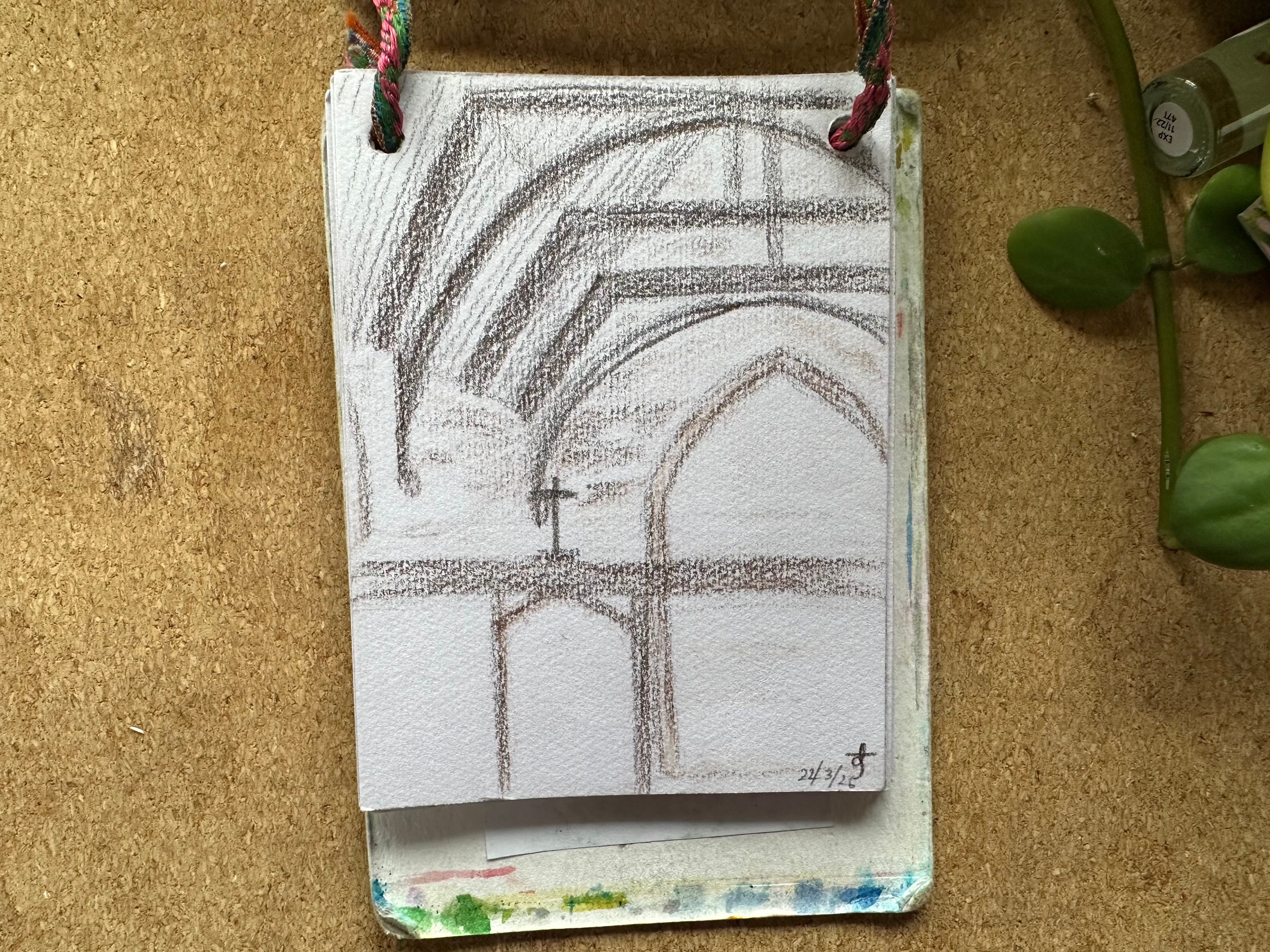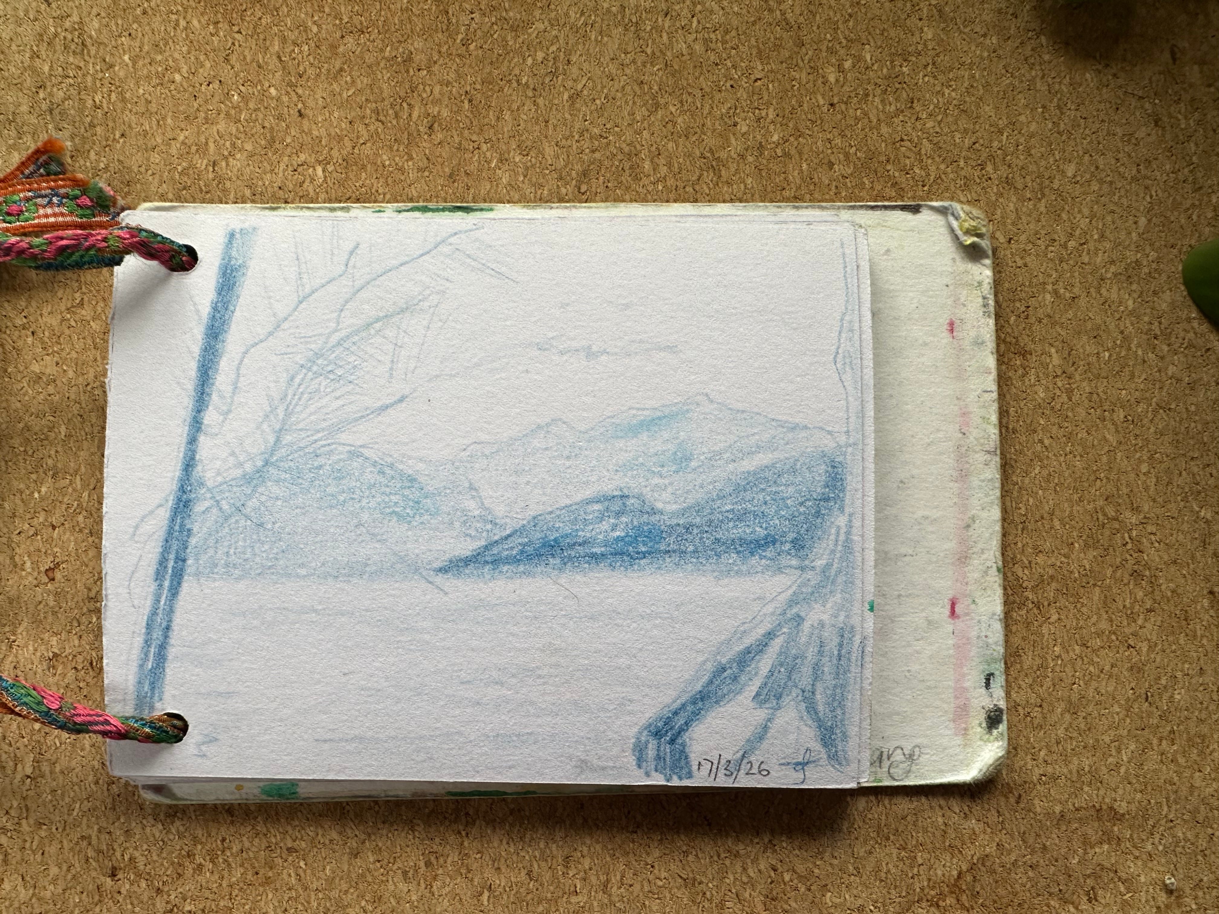 I will post my sketches below for you to see for yourself. I graduated to being a person who makes her own sketchbooks & notebooks a few years ago. These are the simplest ones ever: 2 punched holes, ribbon, paper and card. I’ve got one that is about A6 and one that is about A7 they fit in my pockets along with a pencil or two.